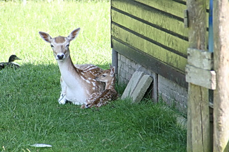Zaterdag 7 juli jongstleden, toen het nog zomers was, zomers warm, ook in en rond de hertenkamp aan de Noordwijkweg….. Met de beide damhertenjonkies gaat het goed. Het oudste jong, het lichtst van kleur, is inmiddels 4 weken. Het voelt zich aardig op zijn gemak, zolang de rust niet wordt verstoord. De jongste ‘Bambi’ is wat donkerder, staat ook al behendig op zijn pootjes en rent af en toe dat het een lieve lust is. Overigens, “Bambi” is een Disney-naam, er wordt gewerkt aan een naamgevingsactie, een suggestie van enkele kinderen en een belangstellende ouder. Met de beide hindes is het wat moeilijk communiceren voor wat betreft de namen voor hun jonge spruiten, ze lopen er hard voor weg……