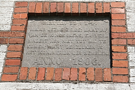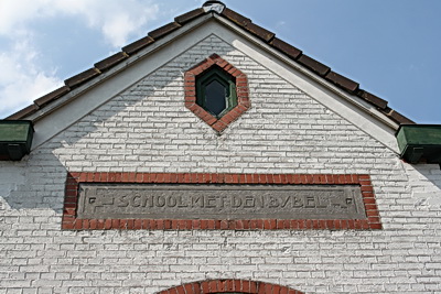 De tekst die nog steeds aan de voorkant van het oude schoolgebouw is te lezen, met enige moeite (en enigszins een stijve nek…)
