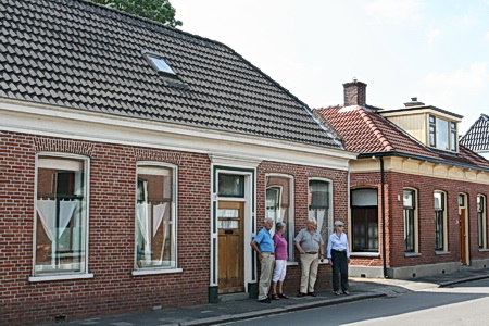 De Zuijdijks en de Datema’s voor het huis waarin (aan de noordkant) de geëvacueerde familie Zuijdijk van herfst ’44 tot oktober ’45 woonde, inkwartiering bij de oude mevrouw Auwema. Nu woont hier de familie Bellinga.