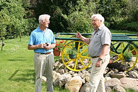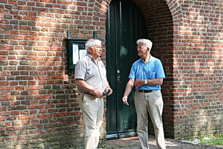 Jan Zuijdijk en Sjabbo Datema anno 2012 bij de toren van de Hervormde Kerk, waar de ‘jongens’ van ’45 vaak Duitse soldaten aantroffen op het (school)plein, al of niet bezig wapens te poetsen. (CORRECTIE: Op het schoolplein zaten in de dagen na de bevrijding wel eens CANADESE soldaten!)