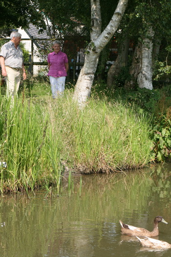 De echtparen Zuijdijk en Datema aan de rand van Homans gracht. Op de achtergrond de woonboerderij van de familie Achterhof, vroeger het boerenbedrijf van o.a. Vennema, later Helmus.