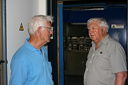 Kenmerkende afscheidskiek… Sjabbo Datema en Jan Zuijdijk, napratend over de tijd van toén… Op de achtergrond de ruimte met de melkrobot, symbool staand voor de tijd van nu. Er is heel wat veranderd in de loop der jaren!