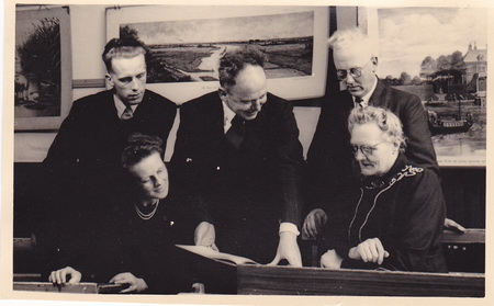 Het onderwijzend personeel van de School met de Bijbel aan De Gast (in de bezettingsjaren?). Zittend de dames Bakker en Beintema. Staand de meesters Bouwman, Slings en Hijszeler. Let ook op de oude schoolplaten op de achtergrond!