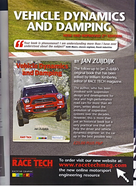 Als illustratie een advertentie van het boek van Jan Zuijdijk “Vehicle Dynamics and Damping” dat wereldwijd wordt verkocht, in kleinere aantallen vanwege het specialistische karakter.