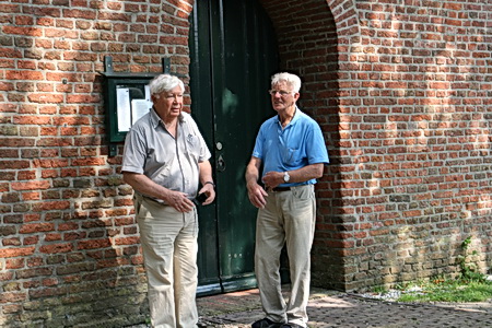 Woensdagmiddag 4 juli jongstleden. Jan Zuijdijk en Sjabbo Datema op de plek waar in de dagen na de bevrijding in april ’45 wel eens Canadese soldaten zaten, o.a. hun wapens schoonmakend en oppoetsend.