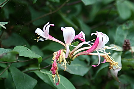 Nog geen drie stappen buiten de achterdeur en de eerste kiek is gemaakt: Bloem van de kamperfoelie, boeiend van vorm.