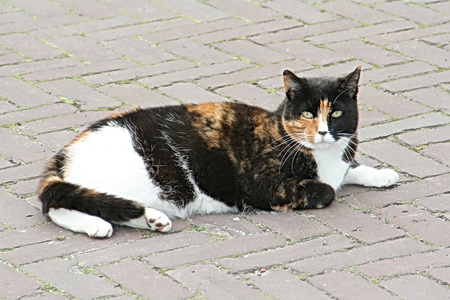 Een van de poezen van de overburen gaat gewillig poseren, midden op straat. Even daarvoor lag ze in sluiphouding richting tortelduif die echter attent reageerde.
