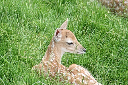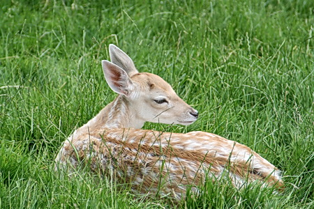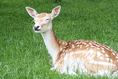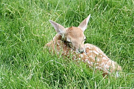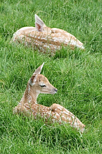 Het jongste damhertje ligt onstpannen in het gegroeide kampgras, nabij de andere Bambi. Rust heerst, weldadig voor de dieren. De veelkleurige haan houdt toezicht, een eendendelegatie is naar ons onderweg, verder (bijna) volledige bewegingloosheid…