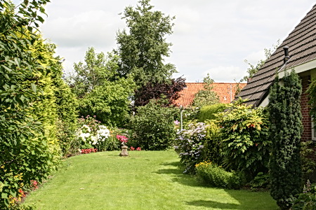 De prachtige, ruimte scheppende tuin naast het huis van Willy en Janna Helmus aan de Lindestraat. De oude dakpannenwoning op de achtergrond (waar Willy’s broer Piet woont) doet het goed op de achtergrond!