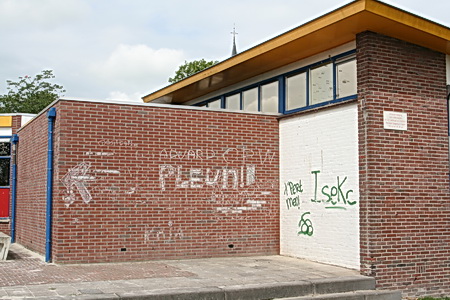 Minder fraai, de bekladde muren aan de zuidoostkant van de OBS De Molshoop. (Ja, dat bordje rechts op de muur zegt iets over de aanwezigheidsregels, maar ja….)