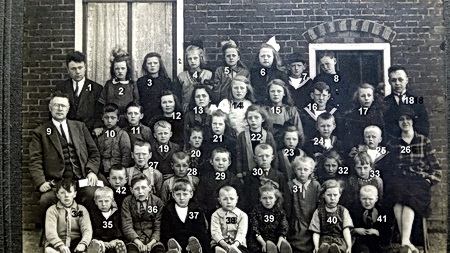 1. Meester Koopman; 2. Annie Spoelstra; 3. Gé Spoelstra; 4. ??? ; 5. Fennie Steenstra; 6. ??? ; 7. Hennie van Til; 8. ??? ; 9. Meester Danhof; 10. Annie Postema; 11.Sjoerd Spoelstra; 12. Griet Spoelstra; 13. ??? ; 14. ??? ; 15. ??? 16. Herman (?) van Til; 17. Trien van Til; 18. Meester van der Molen; 19. ??? ; 20. ??? ; 21. ??? 22. ??? ; 23. ??? ; 24. … van Til; 25. ??? ; 26. Juf van de Riet; 27. Eelke ? / Gerben? Posthumus; 28. ??? ; 29. ??? ; 30. ??? ; 31. ??? ; 32. Gerkje van Til  (dit zou dan niét Jeltje Wilpstra zijn….) ; 33. ??? ; 34. Jo Spoelstra ; 35. ??? ; 36. … Renkema ; 37. ??? ; 38. ??? ; 39. ??? ; 40. Albertje Teeninga; 41. ??? ; 42. ????