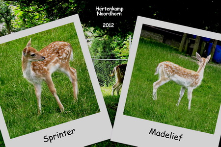 De jonge damhertjes in de hertenkamp hoeven trouwens niet langer met BAMBI 1 en BAMBI 2 te worden aangesproken, de dierverzorgers hebben een keus gemaakt uit diverse namen, aangeleverd door Noordhorner schoolkinderen. (Zie ook www.dorpsbelangennoordhorn.nl). Het oudste jonkie, het lichtst van kleur, gaat als ‘MADELIEF’ door het leven, het jongste jonkie, iets donkerder, heet vanaf nu SPRINTER!