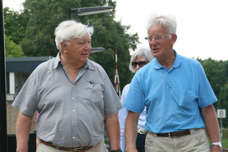 Jan Zuijdijk en zijn vrouw Jannie Hermans, te gast bij Sjabbo Datema die op de achtergrond staat in zijn huis aan het Van Starkenborghkanaal. Woensdag 4 juli 2012, 67 jaar na de evacuatieperiode 44-45. Alle drie waren toen nog schoolkinderen. Jannie, ook uit Den Bommel, verbleef in Garmerwolde. Jan in Noordhorn aan de Langestraat. Sjabbo was iets jonger. Beide laatstgenoemden gingen naar de School met de Bijbel aan De Gast.