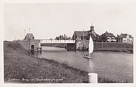 De brug tussen Noord- en Zuidhorn over het Van Satrkenborghkanaal, jaren geleden. Het brugwachtershuisje zit nog aan de oostkant van de brug, de Gereformeerde Kerk staat er nog en ook het later afgebrande huis naast de pastorie is nog intact.
