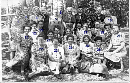 1. Onbekend; 2. Mw. Heeres, echtgenote van het hoofd van de OLS; 3. Onbekend; 4. Mw. Buining (de moeder van Jan Buining, heeft in het huis naast meester Heeres (en Dijk) gewoond; 5. Mw. Iet Siccama-Zantinga, de vrouw van Job Siccama, woonde later aan De Gast; 6. Mw. Mien Wieringa-Zetsema, de moeder van Jan, Jaap en Lena, Langestraat 39; 7. Mw. A.Schuiringa-van der Veen, getrouwd met Feike Schuiringa (oom en tante van Gaaike Schuiringa) Zij is onderwijzeres aan de OLS in Noordhorn geweest; 8. (met baret) Mw. Anne Dijkstra, getrouwd met Koos Dijkstra, woonde aan de Noordhorner Gast; 9. Onbekend; 10. Onbekend; 11. Leen Wieringa denkt dat het Cor Vos is, een juf van de huishouding; Gaaike Schuiringa houdt het op Geertje Toppen (Langestraat); 12. Mw. Poll-Dijkstra, dochter van Anne Dijkstra (nummer 8); 13. Onbekend; 14. Mw. Van Dijk, getrouwd met kweker Klaas, moeder van Auke; 15. Mw. Trien Pol, huishoudster bij Popke Gaaikema; 16. Onbekend; 17. Onbekend; 18. Mw. Spoelma (textiel en stoffen, Langestraat; nu kapsalon); 19. Mw. Siccama-Boer (nu boerderij Stigter); 20. Mw. Jo Bakker-Bausch (woonde in het Waterschapshuis in Zuidhorn); 21. Mw. Diepstra (Stationsstraat, Zuidhorn); 22. Mw. De Boer-Jager, de vrouw van Cees de Boer (Langestraat); 23. Mw.Van Lune-Feldkamp, de vrouw van Piet van Lune sr.; 24. Onbekend; 25. Onbekend; 26. Mw.Iet Boer-Homan, de vrouw van Jurrien Boer, de moeder van nr.19); 27. Mw.Oosterhuis-Benedictus (van de garage, moeder van Roelof).