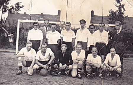 Voetbalelftal Zuidhorn (zaterdag) in de jaren vijftig met staand, tweede van rechts, scheidsrechter Harm Wonderman