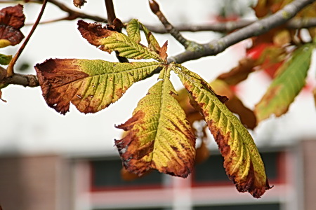 Soms valt je een herfstdetail op, zoals dit kastanjeblad. Verkleurend, verdrogend, waarschijnlijk nu al wel door de stormachtige wind naar een lager niveau verbannen…