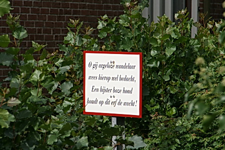 Een originele tekst bij de oprit van de familie Scholtens om duidelijk te maken dat er een waakhond aanwezig is… (De hond deed dat zelf overigens ook al, traditioneel blaffend)
