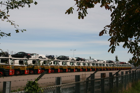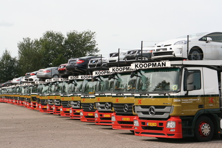 De parkeerplaats van Koopman Transport, nog steeds in Noordhorn gevestigd en niet naar Drachten verhuisd. De vrachtwagens allemaal keurig in het gelid, een fraai ogende presentatie!