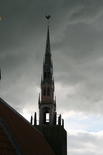Sfeerbeeld van de kerktoren tegen een dreigende donkere lucht, hopelijk niet symbolisch voor wat betreft de toekomstverwachtingen….