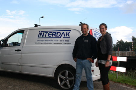 “De naam INTERDAK?? Zelf verzonnen, met een beetje hulp. Ik wist al tijden dat het iets met “INTER” zou moeten zijn…. Het bekt lekker!” Aan het woord: Dakdekker Pieter Horenga, die samen met zijn vriendin Jeanine Schreiber het Noordhorner bedrijf ‘draagt’. Pieter is geboren in Doezum, verhuisde al jong met zijn ouders naar Briltil en ging daarna op zichzelf wonen (en werken) in Groningen. Na zijn VBO-tijd deed hij werkervaring op bij Miedema’s Montagebouw en het Leekster dakdekkersbedrijf van Fokkema. Toen kriebelde het al, “ik dacht ik begin voor mezelf!” De drijfveer? “Ach, er zitten veel zelfstandigen in de familie, mijn ouders hadden een veehouderij. De uitdaging trok me, verantwoordelijk zijn voor je eigen portemonnee… Je moet ook het geluk op je hand hebben!” Hoe dat zo? “Je hebt contacten nodig, die moet je opbouwen! Netwerken!” Niekerker Marcus Hoving en Noordhorner Herman Kalf bleken in de praktijk waardevolle “pushers”. “INTERDAK”, specialist in platte daken, startte in april 2003 in Stad, maar verplaatste al gauw zijn zetel naar Noordhorn, “een mooie zichtlocatie”, aldus de enthousiaste Horenga. Het bedrijf aan huis zit vlak bij de brug tussen Noord- en Zuidhorn, vanuit de sfeervolle huiskamer heb je zicht op zowel de drukte op de N355 als op de intensieve binnenvaart op het Van Starkenborghkanaal. Zoals gezegd is de hoofdzaak voor “Interdak” de dakbedekking (nieuw of onderhoud) van platte daken, “werk aan pannendaken doen we wel, maar dat vormt een uitzondering”. Ook de klussen met zink en koper gaan Horenga uitstekend af. Als het nodig is, krijgt hij assistentie van zzp’ers en/of oproepkrachten. “We werken met bitumen”, aldus Horenga, “het woord ‘dakleer’ is in de ban gedaan!” “O….” (Zo leer je altijd weer wat! Bitumen zijn in de bodem voorkomende koolwaterstoffen als aardolie, aardgas, aardwas, bergteer, asfalt etc.) Sinds oktober 2006 neemt Pieters partner Jeanine Schreiber de administratie (facturering, planning etc.) voor haar rekening, positief voor het goedlopende bedrijf, dat ook werk maakt van de advisering betreffende de buitenkant van woningen. “We proberen elke klant het gevoel te geven op de eerste plaats te komen, maar plannen is soms moeilijk. Je bent erg afhankelijk van het weer!” INTERDAK werkt voor particulieren, aannemers, installateurs, klussenbedrijven en…. makelaars! “Makelaars hebben steeds vaker panden in de verhuur en dat vraagt het nodige onderhoud”. Reclame? “We moeten het vooral hebben van de mond-tot-mondreclame”, zegt Pieter, “we zitten nog royaal in het werk”. Het Westerkwartier en de stad Groningen vormen het werkgebied met uitzonderingen als bijvoorbeeld Nieuwe Pekela en Almere (onderhoud kinderdagverblijven). Verschillen met de eerste jaren? “Nee, er zijn niet opvallend veel veranderingen. Wel moet er vandaag de dag sneller, efficiënter worden gewerkt, -tijd is geld-!” INTERDAK (tel. 06 20403289), een vitaal Noordhorner bedrijf! (JB)