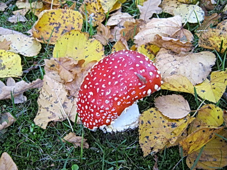 Een vliegenzwam die niet helemaal uitgroeide tot het prototype, bekend van “Op een grote paddenstoel, rood met witte stippen…” (Ja, die waarop kabouter Spillebeen heen en weer wipte….)