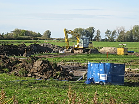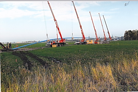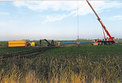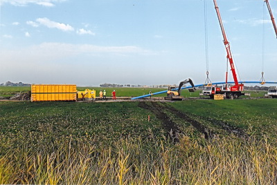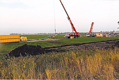 De afgelopen week vond er ten westen van de boerderij “Mokkenburg” een opvallende ‘operatie’ plaats. De nieuwe hoofdwaterleidingbuis moest niet alleen een eind de bodem in, maar ook onder het spoor door. Voor dat doel werd er een doorgang onder de spoordijk geboord. Met behulp van een handvol hijskranen werd de blauwe buis de grond in gewerkt, onder het spoor door ‘gestoken’. Foto’s van belangstellende toeschouwer Henk Geertsema (Noordhorn):