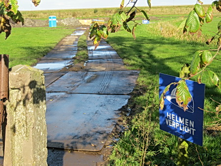 Situatie aan de zuidkant van de spoordijk, tussen kanaal en spoor in, op het land van Datema. “Helm verplicht”…..