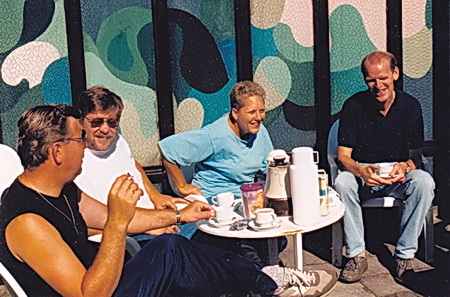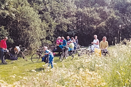 Per fiets op weg naar Noordlaren, tussenstop tussen Lettelbert en Leekstermeer. Jaren tachtig? Tweede van rechts Harma Postema, naast Dea Pol. Op de voorgrond Ronnie Zevenberg. links JB