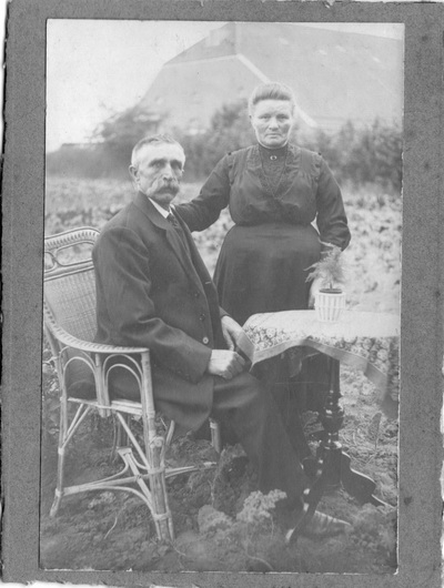 Ook een oude foto, toegestuurd door Theo van Hoogen, afkomstig uit het album van zijn grootmoeder Sijtske Van Hoogen-Roeters. Prachtige plaat, niet alleen wat de twee mensen betreft, ook de locatie, de kleding, de enscenering (zo met stoel en al in je zondagse kleren tussen de boerenkool…) Wie weet wie er op de foto staan? Waar is de foto gemaakt en wanneer (ongeveer)?