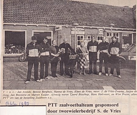 Wat klinkt dat nog vertrouwd, P T T …… Nee, geen klaagzang van mijn kant over de huidige PostNL. Daarover wordt al meer dan genoeg gemopperd en vaak niet bijster therapeutisch. Of deze PTT’ers nog allemaal in de besteldienst zitten? Vast niet! Jan Arends in ieder geval niet. De huidige inwoner van Aduard is, als ik goed ben ingelicht, concierge op een school in Groningen. Bennie Berghuis? Mij niet bekend…. Hanna en Klaas staan hier positief in the picture, evenals hun moeder die toen nog leefde. Jurjen de Jong? Jan Boonstra? Martin Kuiper? Ik weet het niet…. Tjeerd Bisschop? Zegt me niets…. Hans Hakvoort doet iets in de begeleiding van zwakkeren in onze samenleving bij “De Zevenster”, Wim Pruims huidige status ken ik ook niet. Vele vraagtekens dus, maar in oktober 1985 was het nog klip en klaar: PTT-besteldienst Zuidhorn! Ooit nam deze dienst bromfietsen in gebruik die werden geleverd door Sijtse de Vries! Ook het onderhoud en de reparaties werden in Noordhorn afgehandeld. Bromfietsbesteller ergens onderweg met pech? De firma De Vries fungeerde als ophaaldienst voor besteller en vervoermiddel! Bestelfietsen werden destijds ook geleverd door het Tweewielerhuis, daarin bracht het overlijden van Sijtse de Vries op 67-jarige leeftijd geen verandering. Zoon Klaas trok de lijn door. Vandaar dat de sponsoring door middel van trainingspakken voor het PTT-zaalvoetbalteam geenszins uitzonderlijk was. Of het Tweewielerhuis levert aan de huidige PostNL??? Mij niet bekend, er is in de afgelopen 27 jaar veel veranderd! Zowel in de postbezorging als in de sponsoring. Een tankstation van Gulf-merkbenzine, nee, die is er in ieder geval niet meer aan de Langestraat…