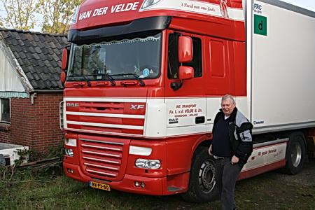 Lukas van der Velde bij zijn DAF-truck, op punt van vertrek