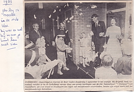 Vooruit, nog twee plakboekberichten uit het oeuvre van mevr. Riek Tempel-Hekkema…. Het eerste bericht betreft het huwelijk tussen toenmalige Kompasleerkracht Kees Kugel en muziekdocente Katrien de Boer, met een persoonlijke noot van Riek Tempel in de marge…. Het tweede bericht gaat over het slaan van de eerste paal voor de nieuwe Burglervestiging aan het eind van de Industrieweg (of het begin van die straat, het is maar waar je je bevindt…) dichtbij de spoorbrug over het Van Starkenborghkanaal. Nog vers in het geheugen en toch al weer bijna dertig jaar geleden….: