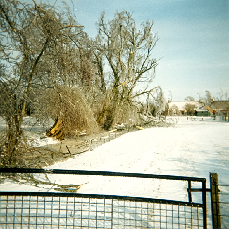 Aan de Moeshorn, maart 1987, bij het huis van Leendert en Saakje Meijer. Afgeknapte takken van de berken door de ijzelzwaarte…