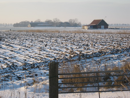 Terug over het redelijk goed begaanbare fietspad langs de N355, gadegeslagen door tientallen kraaien op het geploegde maisland met de Tempelschuur op de achtergrond.