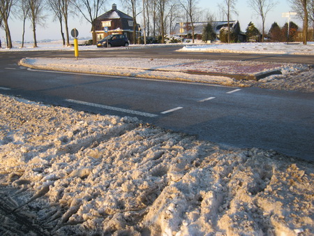 Tot slot de situatie bij de noordelijke afslag N355, het dorp in. Aandacht genoeg voor de rijbanen, maar de verbindingsstukjes naar o.a. het fietspad zijn dagenlang “een troep”…. Net als het eerste deel van het trottoir… Nou ja, dan maar op de weg lopen, is die ook voor óns schoongeveegd…