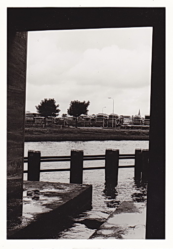 Onderdoorkijkje vanaf de noordoostkant bij de spoorbrug. Op de achtergrond de voorganger van het onlangs gesloten overdekte zwembad “De Waterborgh”, openluchtbad “De Dobbe”. Illustratie van de ingrijpende veranderingen in een relatief kort tijdsbestek. In dit geval VERSLECHTERINGEN, want het nieuwe overdekte bad (concept Kollum) is geen volwaardig alternatief.