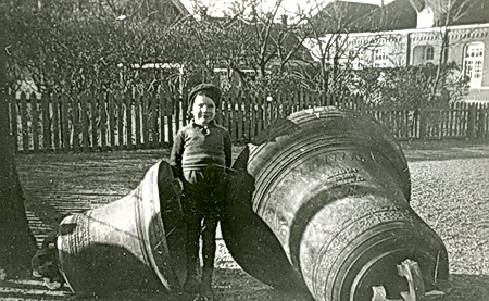 De bewuste foto, door Henk Geertsema genoemd. Hier staat “Pedde” tussen twee ‘gevorderde’ torenklokken. (Niet dus Jaap Helmus, zoals wel eens in de toelichting staat bij deze foto!) Plaats: Bij de kerktoren, rechts op de achtergrond de oude O.L.S., later Paluno.