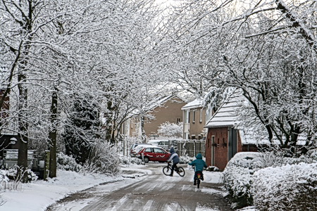 Prachtig gedeelte van de Noordwijkweg met rechts huize Hommes, het vroegere Dijkstra-boerderijtje. Mika en vriendje?broertje? vinden de gladheid een lust voor de crossfiets…