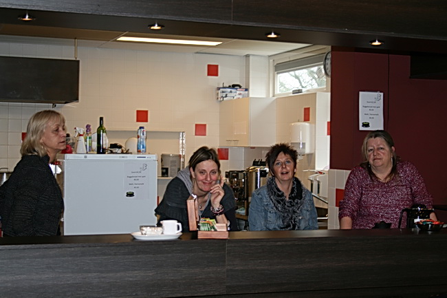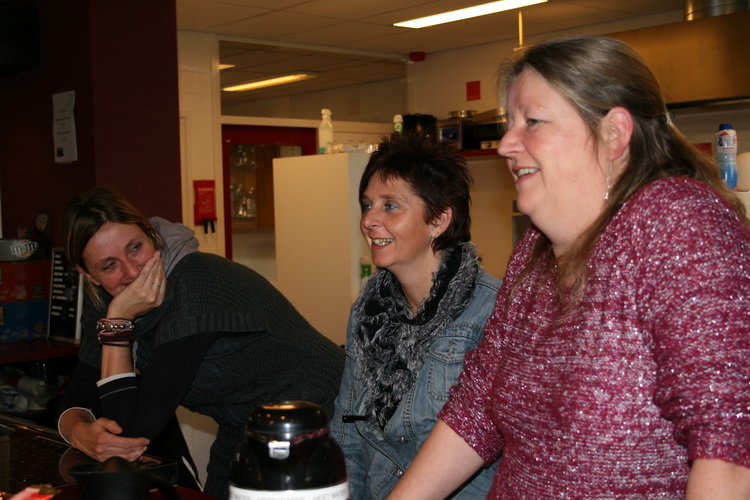 Ach, het viertal barmedewerkers is éven werkloos en daar houden ze niet van. Dan gaan meteen de mondhoeken naar beneden… (Al houdt Anyk keurig haar hand ervoor…)