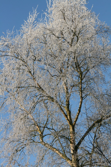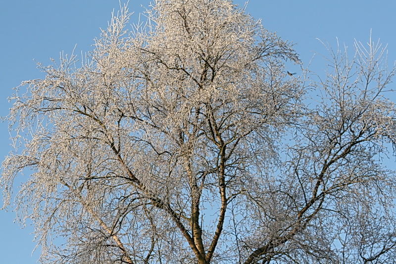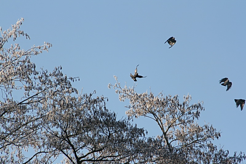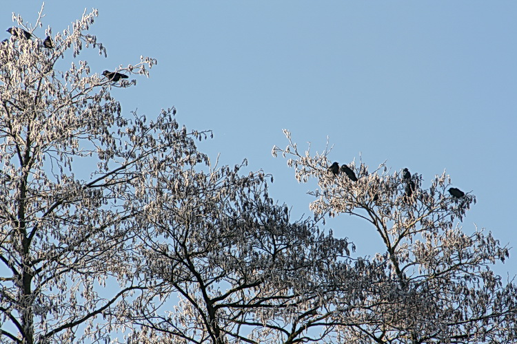 Ja, ik vond het koud vanmorgen, brrrrr! Maar prachtig om te zien, zowel het ochtendlicht als de rijp op de nabije berken. Bovendien hadden de kraaien een jolige bui….