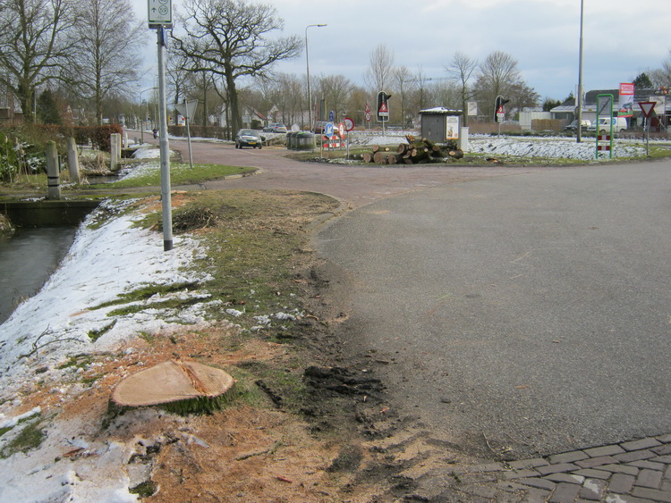De bomen op de middenberm tussen straatweg en parallelweg, bij de glascontainers, gaan hun ondergang tegemoet. “Uit stof zijt gij….”