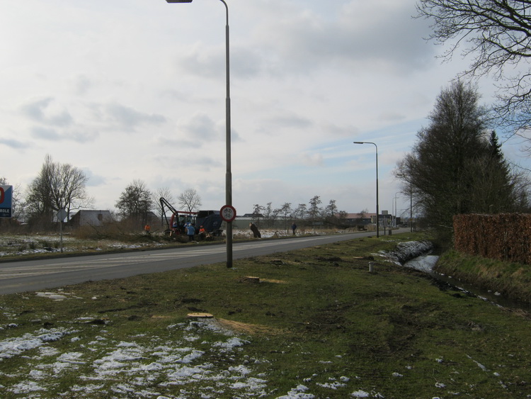 De Langestraat-Zuid waar de straat rechts afbuigt naar de N355. Rechtdoor de parallelweg richting brug en kanaalweg.