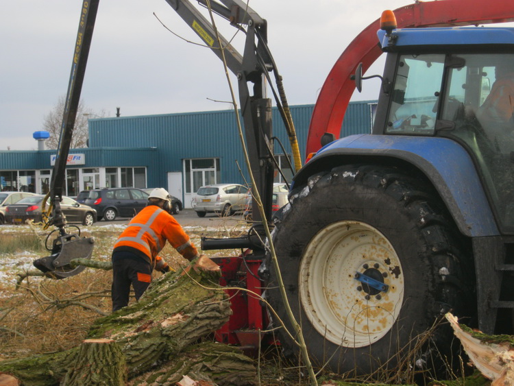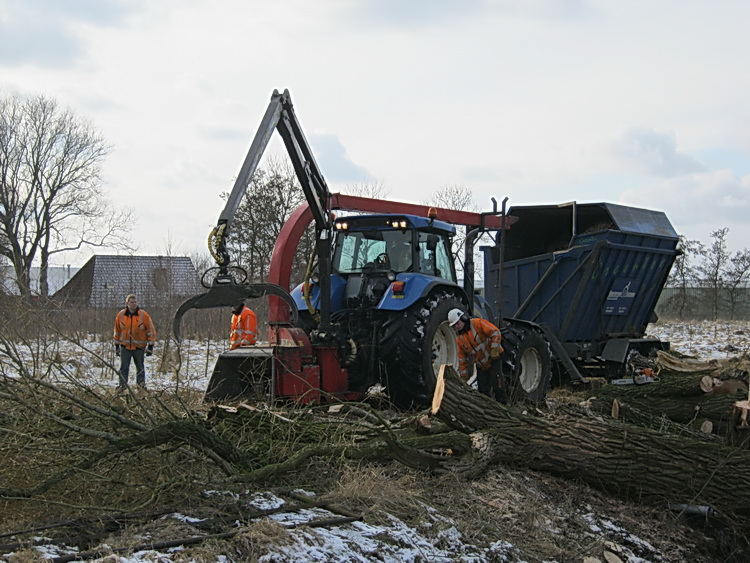 ’s Middags spoed ik me met de lutje Canon opnieuw naar “there where the action is…” Even geen neerhaalbemoeienissen, maar wel grondig verwerken van alles wat er aan boomstammen vast zit. De machtige versnipperaar, eigenlijk meer een verpulveraar, doet het werk grondig en blaast “wat over is” in een gereedstaande wagen. De eerste kaalslagdag maakt pijnlijk duidelijk dat jarenlange groei geen garantie is voor een lang(er) en gelukkig leven. “Ja, de vooruitgang, meneer! En wie treurt er nou om een boom???”