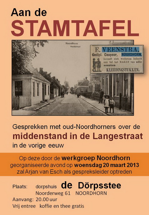 De Werkgroep Noordhorn van de Historische Kring Zuidhorn, zoals de ‘Werkgroep Noordhorns Verleden’ tegenwoordig kennelijk heet, organiseert woensdag 20 maart a.s. in het dorpshuis “De Dörpsstee” aan de Noorderweg STAMTAFELGESPREKKEN over de vroegere MIDDENSTAND in de Langestraat. Aanvang 20.00 uur, entree gratis, evenals de koffie en thee. (En ik denk dat er ook wel herinneringen aan de winkels in Schippersstraat, Noorderweg, Nieuwstraat en Achterweg aan bod zullen komen…) Zie bijgaand affiche van de Historische Kring: