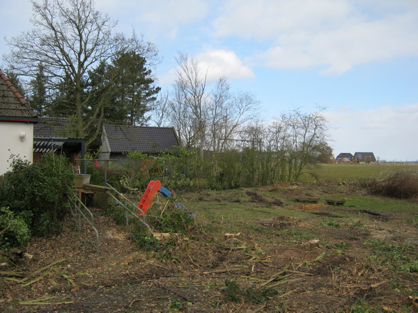Ook aan de achterkant van Langestraat 11 en 9 een kaalslag, met uitzicht op Esdoorn- en Meidoornstraat-Zuid. IN het weiland waaiende wimpels en rondtollende ballen, ter verschrikking van vogels met nestelintenties….