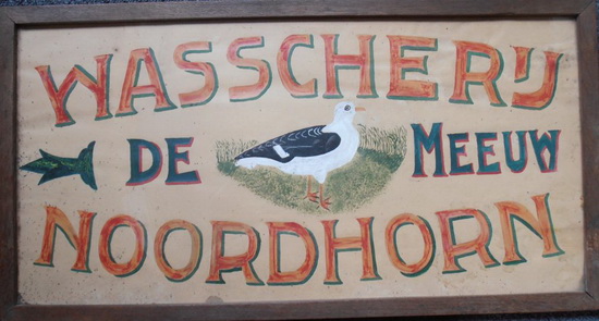 Naar aanleiding van de aankondiging van de stamtafelgesprekken (Werkgroep verleden Noordhorn, d.d. 20 maart 2013, dorpshuis De Dörpsstee) stuurde Aartje Krijger een berichtje. Ze had inmiddels ook contact gehad met Arjan van Esch, beoogd gespreksleider en exploitant van de Buurtsuper aan de Noorderweg. Aartje Krijger (Zuidhorn) heeft een wandbord van de vroegere ‘wasscherij De Meeuw’, de nering die de familie De Jager dreef in het pand aan de Noorderweg, waarin nu de Buurtsuper is gevestigd. Het wandbord trof Aartjes partner Abel Cazemier aan in zijn toenmalige behuizing in Niezijl, waarin volgens Abel een dependance van de wasserij gevestigd is geweest. Aartje leek het een goed idee dat het wandbord naar Noordhorn terugkeerde en Arjan van Esch voelde er wel voor het bord een plek in zijn winkel te geven. Mooie deal! Jammer genoeg bleek Arjan ’s avonds te ziek om als gespreksleider te fungeren, maar het wandbord komt in ieder geval naar Noordhorn!