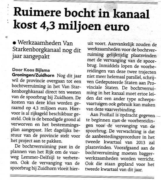 Berichtje, mét foto’s, van razende reporter Jan Thijs de Haan, zoals hij zich spottend zelf noemt: “Jan, je moet niet alleen naar de oostkant kijken, ga maar eens westwaarts, daar zijn ook bomen gekapt langs het kanaal!” Dat leek me zaterdagmiddag een goed idee, kon ik meteen mijn betere fiets proberen, na deze lange winter…. Voorbij de spoorbrug zie ik direct al dat er wordt gewerkt, en dat er is gekapt. O ja, dat is waar ook, het kanaal krijgt een ruimere bocht (kosten ruim 4 miljoen) en de kanaalweg wordt verlegd…: