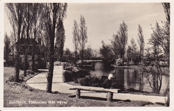 Op het bankje zit een piepjonge Meinderd de Vries uit Noordhorn, uit te rusten van zijn avontuurlijke tocht als kleuter op de step van Noord- naar Zuidhorn, naar het park aan de Wilhelminalaan. Daar in het ‘plantsoen met vijver’ was toevallig een fotograaf bezig, die eigenlijk wel blij was met de aanwezigheid van het jongetje. Geeft de foto iets extra’s! (Met dank aan Paul Wildeboer, van wie ik de ansichtkaart cadeau kreeg!) Op de kaart een poststempel van 1951, 31 juli. De foto is dus van ruim vóór die datum. De kaart is uitgegeven door Boekhandel B. Beereboom te Zuidhorn (Tel. 45)….