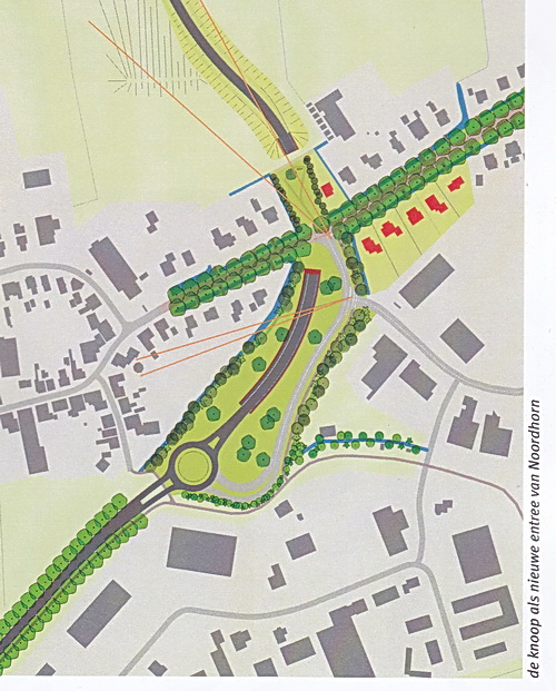 Mooi te zien, de vernieuwde aanrijroute vanaf Grijpskerk, de rotonde als “beeldbepalende knoop”, de groene aankleding van het gedeelte tussen rotonde en tunnel, de reconstructie van de “oude Noordhorner Gast”, de plek waar eventueel nieuwe huizen worden gebouwd en het nieuwe gedeelte van de verlegde N355 tussen tunnel en nieuwe hoge brug, om de boerderij van Holtman heen.